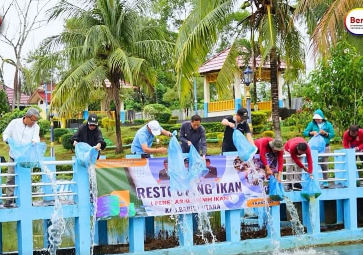 Penjabat Bupati Barito Utara, Drs. Muhlis, didampingi unsur kepala perangkat daerah, melaksanakan kegiatan tabur benih ikan di kolam milik Pemerintah Daerah Barito Utara, Jumat (9/5).